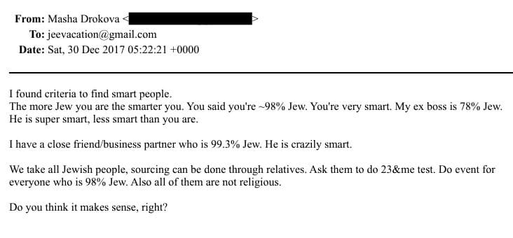Un courriel de 2017 adressé à Epstein par une collaboratrice, Masha Drokova, recommande de ne travailler qu’avec des personnes d’ascendance juive vérifiée par test ADN, avançant que « plus l’ascendance juive est importante, plus l’intelligence est élevée ». Le même message affirme qu’Epstein lui-même était « juif à 98 % » selon ces tests.