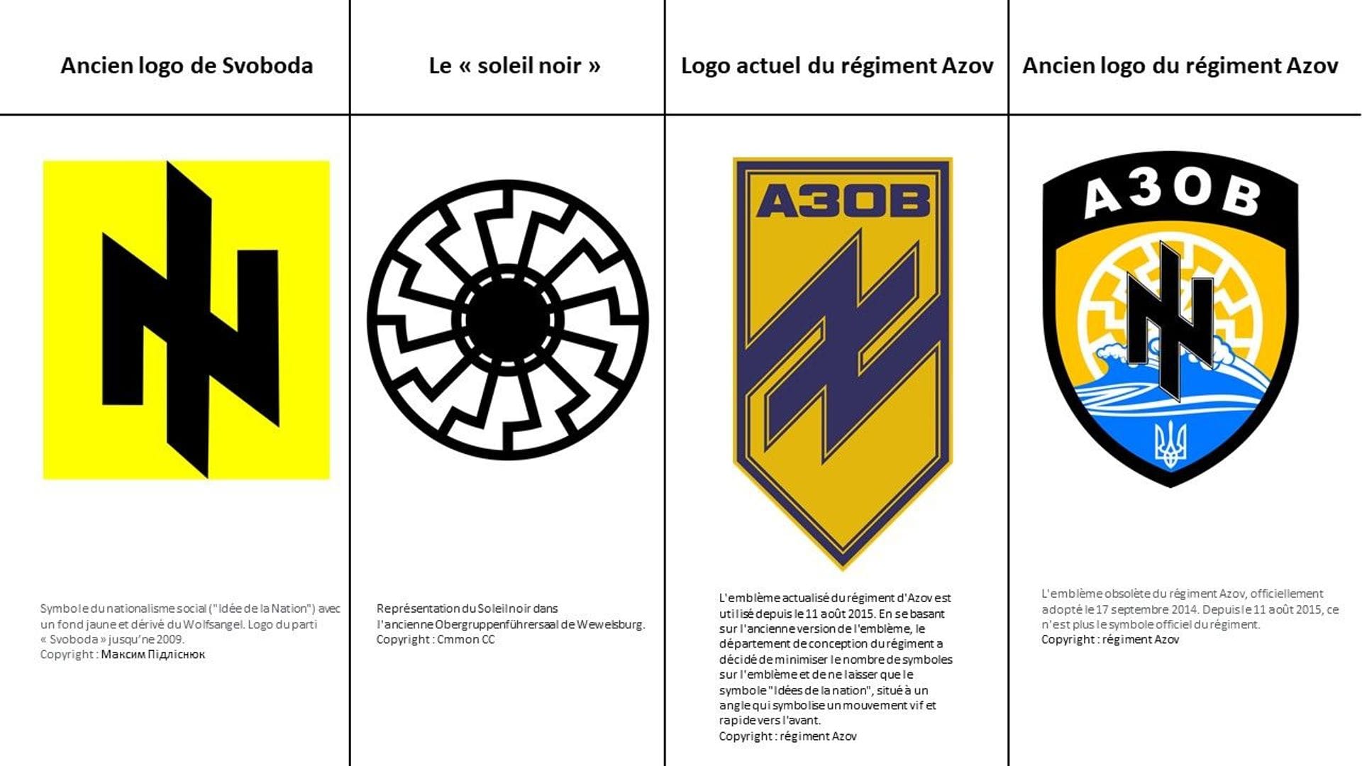 L’emblème utilisé par le régiment Azov est l’ancien emblème du parti ukrainien « Svoboda » (l’Union panukrainienne « Liberté »). Un parti ultranationaliste ukrainien fondé en 1991 sous l’appellation « Parti social-national d’Ukraine ».