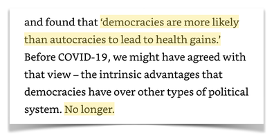Il pousse sa colère jusqu’à affirmer que désormais les gouvernements autoritaires prennent meilleur soin de la santé de leurs populations que les démocraties, en oubliant que, faute de contre-pouvoir, il est rare que les statistiques des régimes autoritaires soient justes et que depuis deux ans les grandes démocraties occidentales développent des pratiques anti-démocratiques et sont en train de muer en régimes autoritaires.