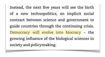 Il annonce l’avènement d’une sorte de scientisme, qu’il nomme « Biocratie » ou le gouvernement par les sciences biologiques.