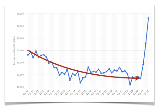 La réalité est que Pfizer était jusqu’à l’année dernière un géant en sursis dont le chiffre d’affaires ne faisait que baisser depuis 10 ans :