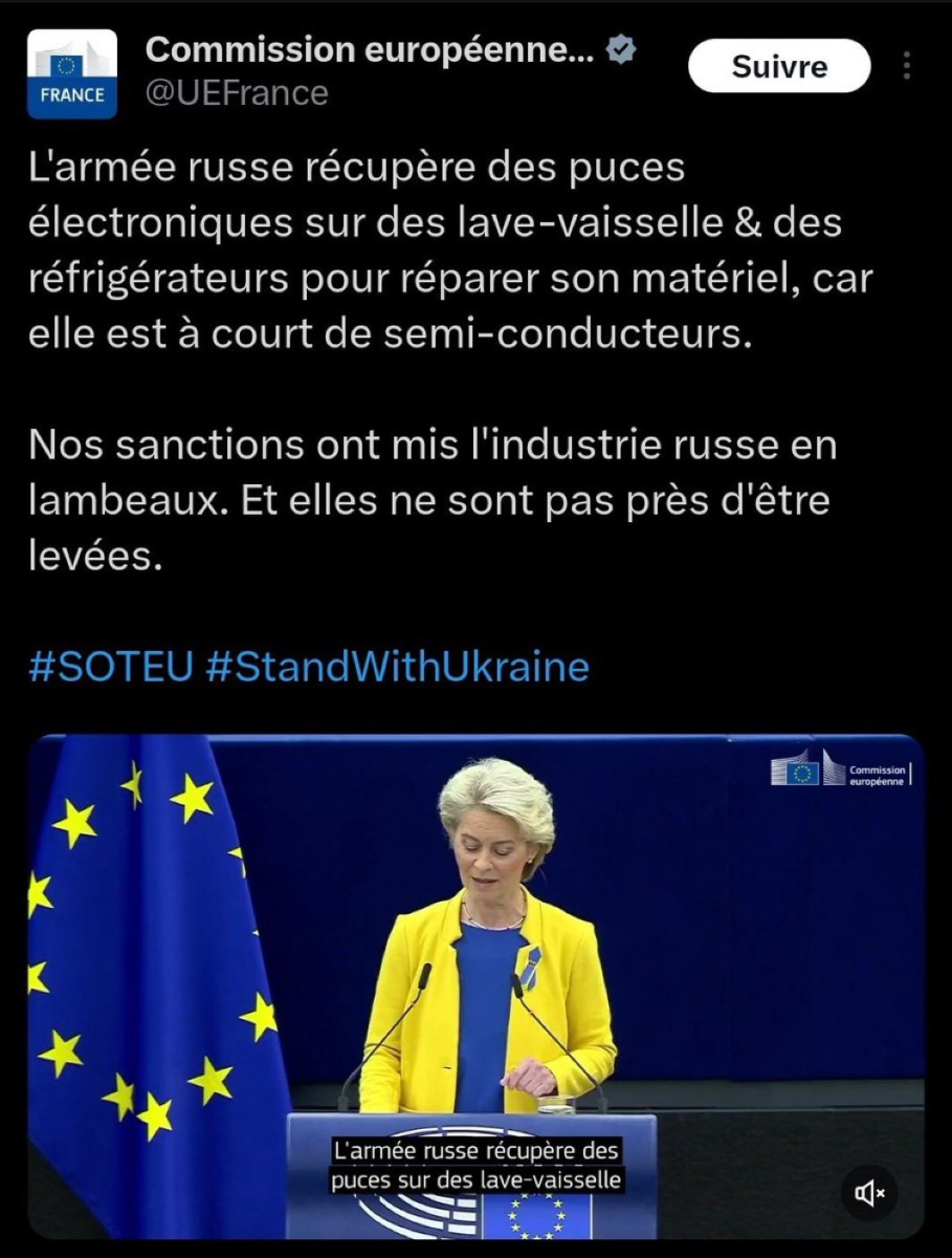 Il y a trois ans, Ursula von der Leyen riait. Avec la morgue satisfaite des vainqueurs autoproclamés, elle peignait la Russie comme une puissance grotesque, réduite à arracher des puces électroniques de ses propres électroménagers pour alimenter son effort de guerre. L’Empire déchu bricolait, l’Occident dominait. C’était la certitude du moment.