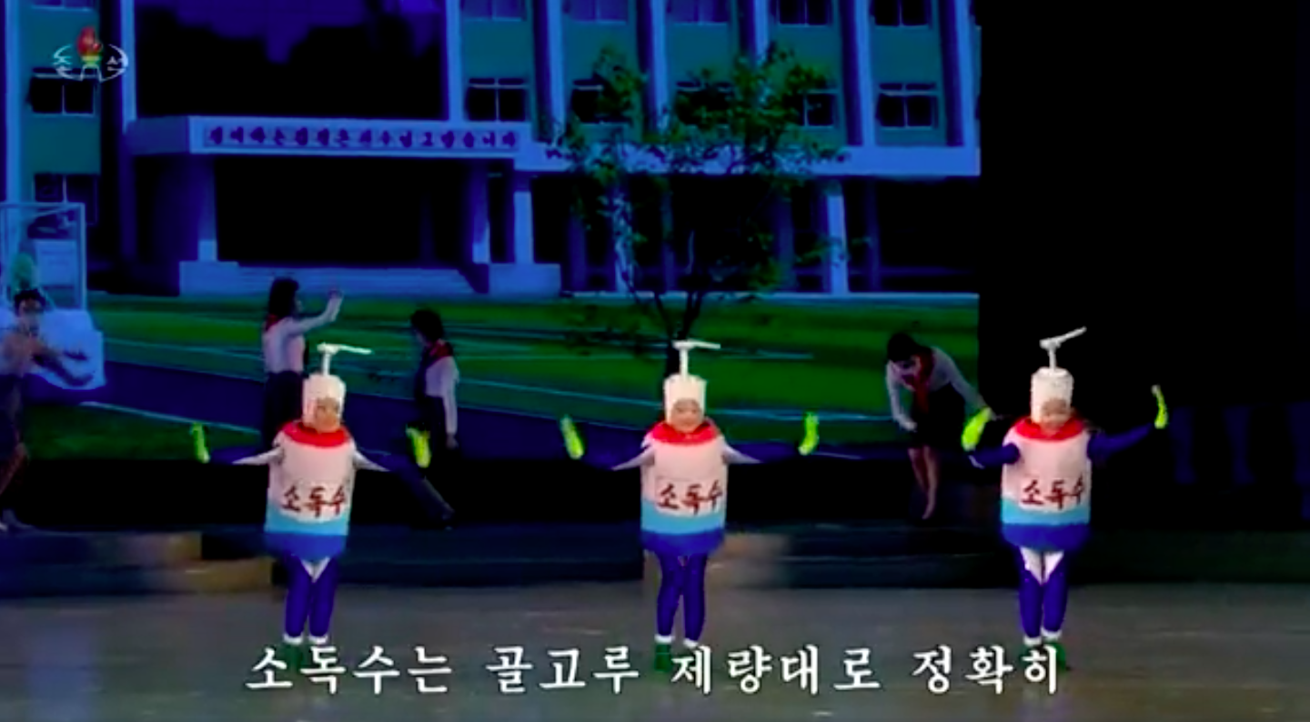 #CoréeduNord 🇰🇵 Des enfants sur scène en costumes de désinfectant pour les mains et de thermomètre, illustrant les mesures visant à empêcher la propagation du #Covid19