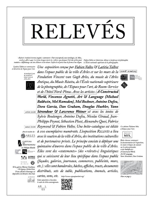 « Le point de départ du projet de l’exposition RELEVÉS est l’invitation faite par Lætitia Talbot à venir penser la présence des énoncés des artistes conceptuels (tels qu’ils avaient été montrés dans l’ouvrage Art conceptuel, une entologie) dans l’espace public. Pour cela a donc été conçue, pour l’espace public de la ville d’Arles, la présence d’une série d’œuvres emblématiques de l’art conceptuel (les statements de lawrence Weiner, la publication de la pièce Schema (1966) de Dan Graham dans un journal quotidien, la diffusion d’une affiche de 1976 de Art and language, la diffusion du texte d’une chanson éditée en 1995, etc.) et la présence d’une série de pièces uniques commandées pour l’exposition (les pièces des collectifs A Constructed World et Art & language, de l’artiste Yann sérandour ou encore de l’écrivain Antoine Dufeu).