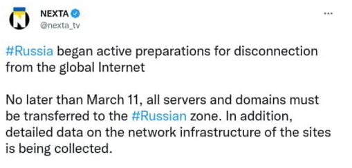 La Russie entre dans sa phase de préparation active de déconnexion de l’Internet mondial, d’après ce que rapporte le média biélorusse Nexta qui publie des photos de documents officiels relatifs à la manœuvre. C’est de l’ordre du plausible quand on sait que Poutine avait déjà procédé à la signature de la loi Runet qui permet de déconnecter la Russie de l’Internet mondial et de la refermer sur son Internet souverain. C’est une espèce de grande muraille numérique à la chinoise dont le contexte actuel fait d’opération militaire en Ukraine et de sanctions à l’encontre de la Russie peut justifier.