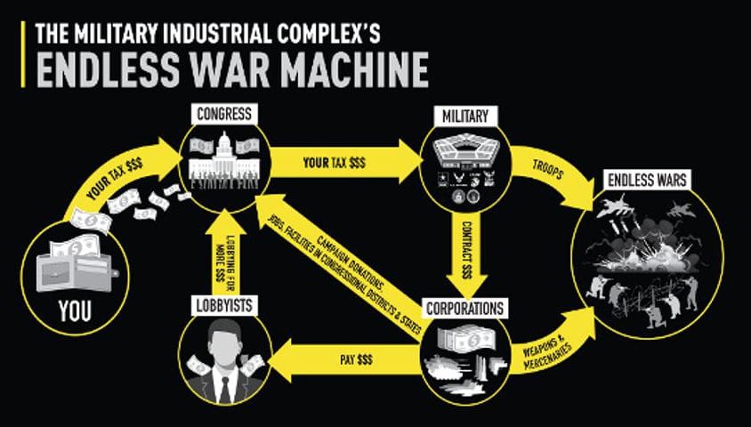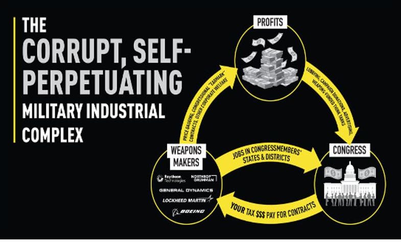Certains défendront le complexe militaro-industriel en insistant sur le fait que nous avons besoin de ses emplois ; d’autres en affirmant qu’il maintient les Ukrainiens en vie et protège le reste de l’Europe de la Russie de Vladimir Poutine ; d’autres encore en mettant en garde contre la Chine. Chacun de ces arguments illustre à quel point le pouvoir du CMI repose sur la fabrication systématique de peurs, de menaces et de crises qui contribuent à enrichir les marchands d’armes et autres membres du CMI en les incitant à augmenter toujours plus les dépenses militaires et les guerres (malgré un bilan presque ininterrompu d’échecs catastrophiques dans presque tous les conflits américains depuis la Seconde Guerre mondiale).