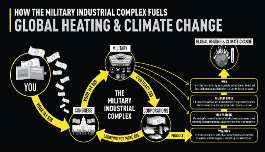 Les dommages causés par la CMI s’étendent à des dégâts environnementaux souvent irréparables, notamment l’empoisonnement des écosystèmes, la perte dévastatrice de biodiversité et l’empreinte carbone de l’armée américaine, qui est plus importante que celle de n’importe quelle autre organisation sur terre. En temps de guerre ou lors des entraînements quotidiens, le CMI a littéralement alimenté le réchauffement de la planète et le changement climatique en brûlant des carburants pour faire fonctionner les bases, faire fonctionner les véhicules et produire des armes.