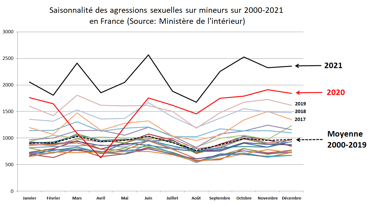 Par une rapide étude de la saisonnalité des abus sexuels sur mineurs, on peut se rendre compte des profils très perturbés de l’année 2020 (chute brutale des plaintes pendant le premier confinement)