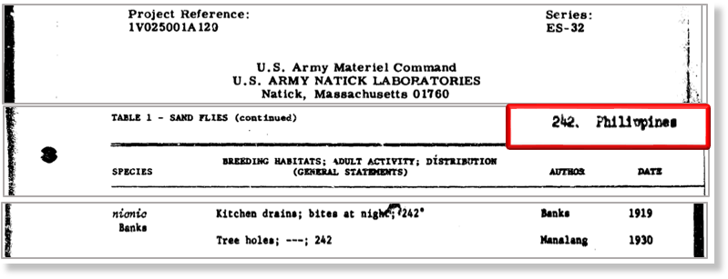 Un rapport de l’armée américaine de 1967 « Arthropodes d’importance médicale en Asie et en URSS européenne » énumère tous les insectes locaux, leur répartition et les maladies qu’ils véhiculent. Les mouches piqueuses, qui vivent dans les drains, sont également répertoriées dans le document. Leurs habitats naturels, cependant, sont les Philippines, et non la Géorgie ou la Russie.