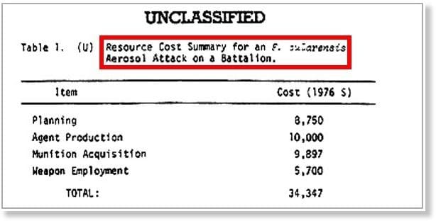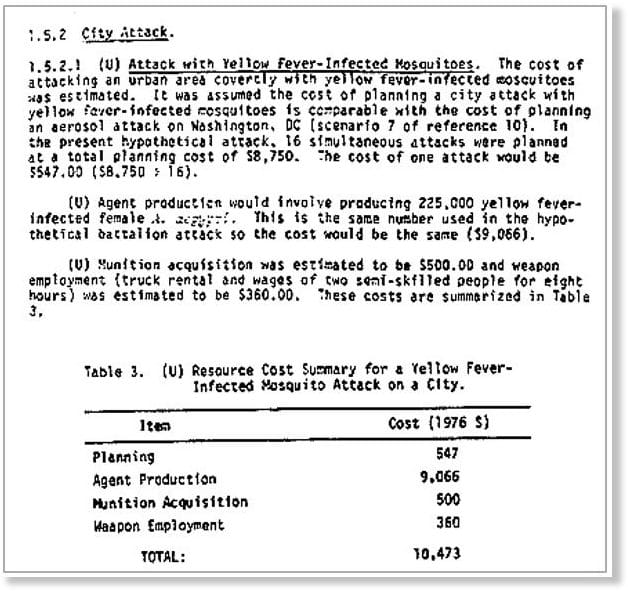 Un rapport de l’armée américaine en 1981 a comparé deux scénarios — 16 attaques simultanées sur une ville par des moustiques A. Aegypti, infectés par la fièvre jaune, et l’attaque par aérosol Tularemia, et évalue leur efficacité en termes de coût et de pertes.
