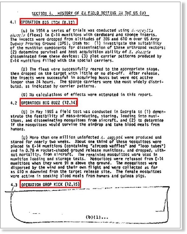 Opération « Big Buzz » : 1 million de moustiques A. Aegypti ont été produits, 1/3 ont été placés dans des munitions et largués depuis des avions, ou dispersés au sol. Les moustiques ont survécu au largage et ont activement recherché du sang humain.