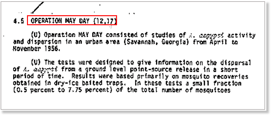 Opération « May Day » : Les moustiques Aedes Aegypti ont été dispersés par des méthodes terrestres en Géorgie, aux États-Unis, au cours d’une opération de l’armée américaine portant le nom de code May Day.