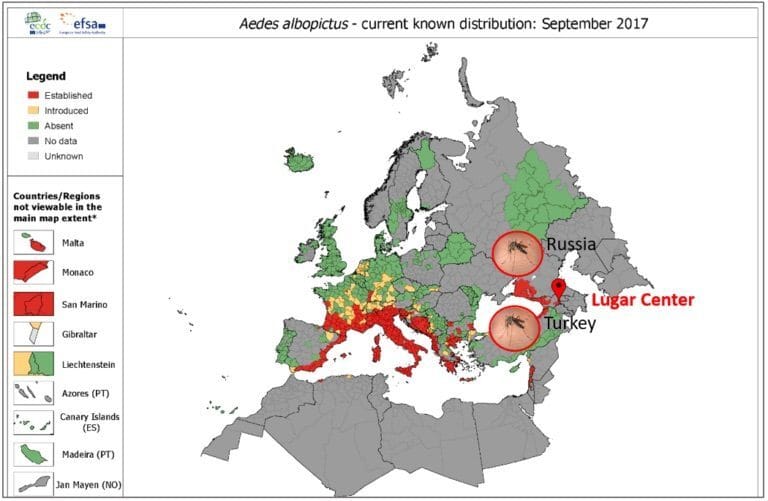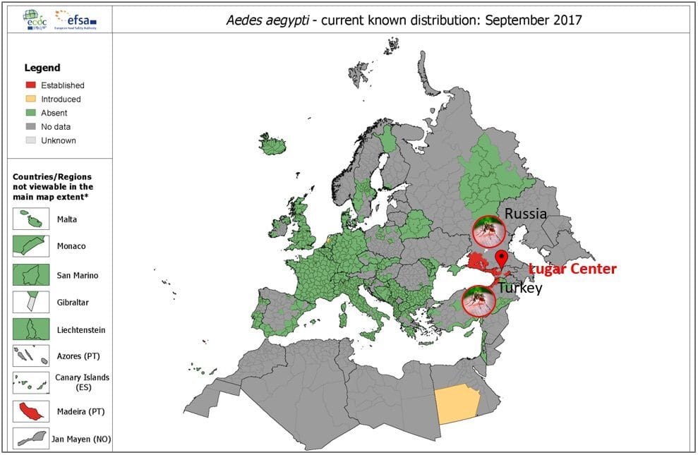 Les moustiques Aedes Aegypti n’ont été distribués qu’en Géorgie, dans le sud de la Russie et dans le nord de la Turquie. Ils ont été détectés pour la première fois en 2014 après le début du programme du Pentagone au Lugar Center.