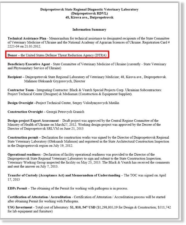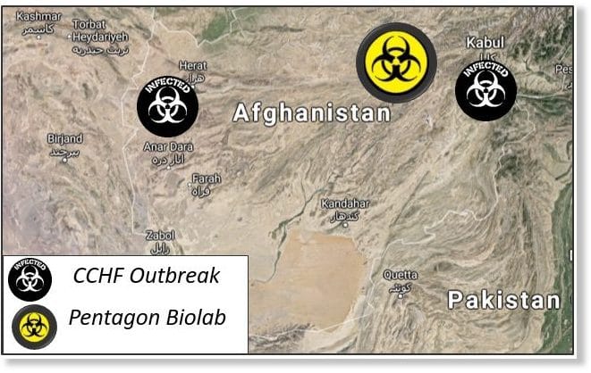 L’Afghanistan est l’un des 25 pays du monde avec des laboratoires biologiques du Pentagone sur leur territoire. Le projet en Afghanistan fait partie du programme de bio défense des États-Unis — « Programme coopératif d’engagement biologique » (CBEP), financé par la « Agence de réduction des menaces de la Défense » (DTRA). Les entrepreneurs de DTRA, travaillant au « Lugar Center » en Géorgie, « CH2M Hill » et « Battelle » ont également été engagés pour le programme en Afghanistan. « CH2M Hill » a obtenu un contrat de 10,4 millions de dollars (2013-2017). Les entrepreneurs du Pentagone en Afghanistan et en Géorgie sont les mêmes, tout comme les maladies qui se propagent parmi la population locale dans les deux pays.
