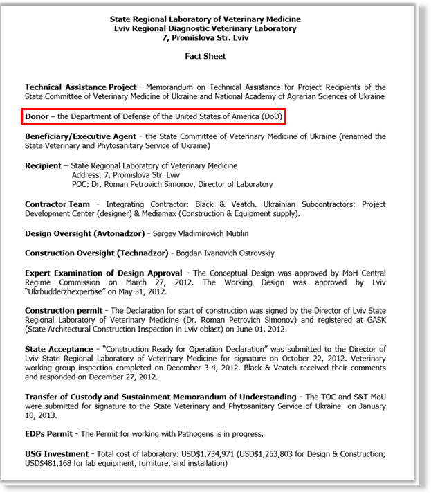 Les informations obtenues du registre fédéral américain des contrats clarifient certaines des activités militaires du Lugar Center — parmi lesquelles la recherche sur les bio-agents (anthrax, tularémie) et les maladies virales (par exemple la fièvre hémorragique de Crimée-Congo) et la collecte d’échantillons biologiques pour futures expérimentations.