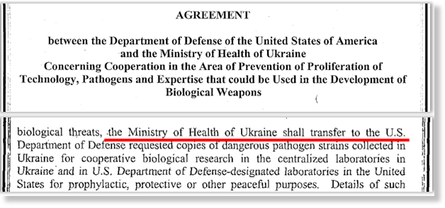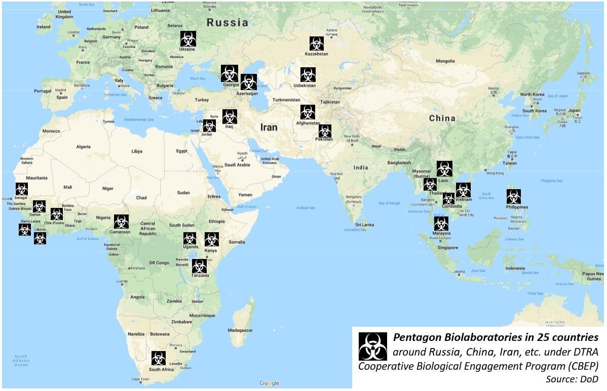 L’armée américaine produit régulièrement des virus, bactéries et toxines mortels en violation directe de la Convention des Nations Unies sur l’interdiction des armes biologiques. Des centaines de milliers de personnes involontaires sont systématiquement exposées à des agents pathogènes dangereux et à d’autres maladies incurables. Des scientifiques de la guerre biologique utilisant la couverture diplomatique testent des virus artificiels dans les laboratoires biologiques du Pentagone dans 25 pays à travers le monde. Ces laboratoires bilogoqies américains sont financés par la Defense Threat Reduction Agency (DTRA [« Agence de réduction des menaces de la Défense »]) dans le cadre d’un programme militaire de 2,1 milliards de dollars — Cooperative Biological Engagement Program (CBEP [« Programme coopératif d’engagement biologique »]) — et sont situés dans des pays de l’ex-Union soviétique tels que la Géorgie et l’Ukraine, au Moyen-Orient, en Asie du Sud-Est et en Afrique.