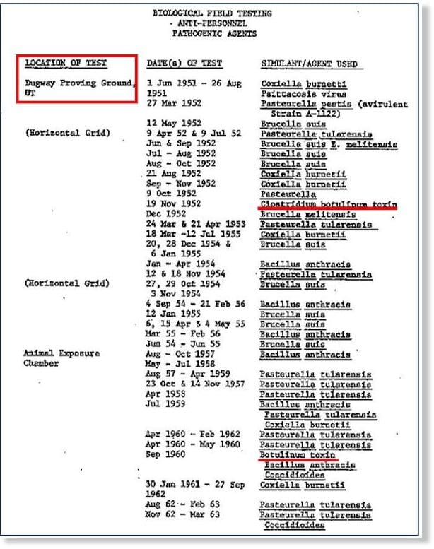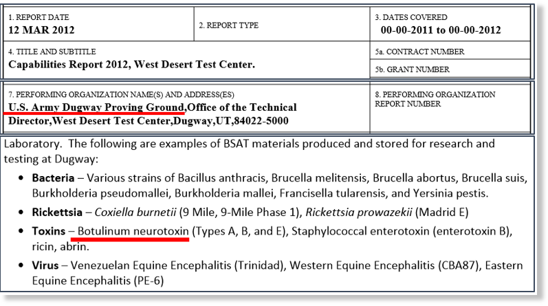 La toxine botulique a été testée comme arme biologique par l’armée américaine dans le passé, ainsi que l’anthrax [Bacillus], Brucella et Tularemia. Bien que le programme américain de fabrication d’armes biologiques ait officiellement pris fin en 1969, les documents montrent que les expériences militaires n’ont jamais pris fin. Actuellement, le Pentagone produit et teste des agents biologiques vivants dans les mêmes installations militaires que par le passé — « Dugway Proving Ground ».