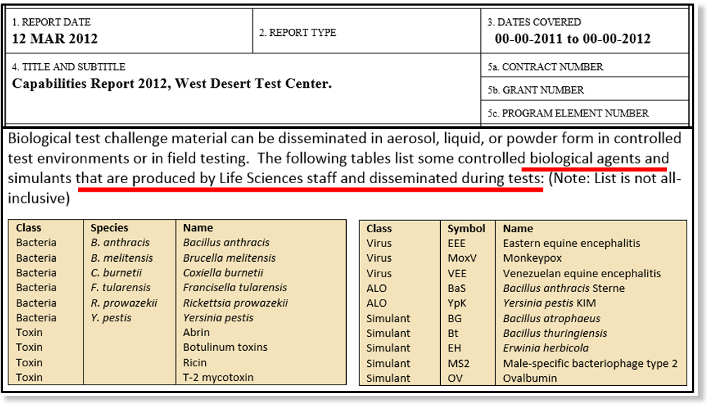 L’armée américaine produit et teste des bio-agents dans une installation militaire spéciale située à Dugway Proving Ground (West Desert Test Center, Utah), comme le prouve un rapport de l’armée américaine de 2012. L’installation est supervisée par le Commandement des essais et de l’évaluation de l’Armée de terre.