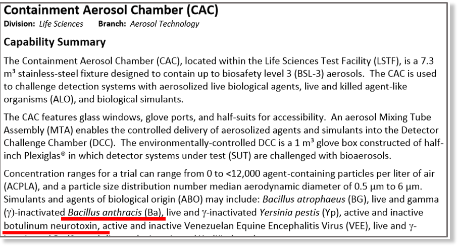 Outre les expériences militaires menées au Lugar Center en Géorgie, « Battelle » a déjà produit des agents de bioterrorisme au niveau de biosécurité 4 du NBACC « LaboratoireTop Secret » de Fort Detrick aux États-Unis. Une présentation du NBACC énumère 16 priorités de recherche pour le laboratoire. Il s’agit notamment de caractériser les pathogènes classiques, émergents et génétiquement modifiés pour leur potentiel de BTA (agent de menace biologique) ; d’évaluer la nature de l’induction non traditionnelle, nouvelle et non endémique d’une maladie à partir d’une BTA potentielle et d’accroître la capacité de tester des aérosols sur les primates non-humains.