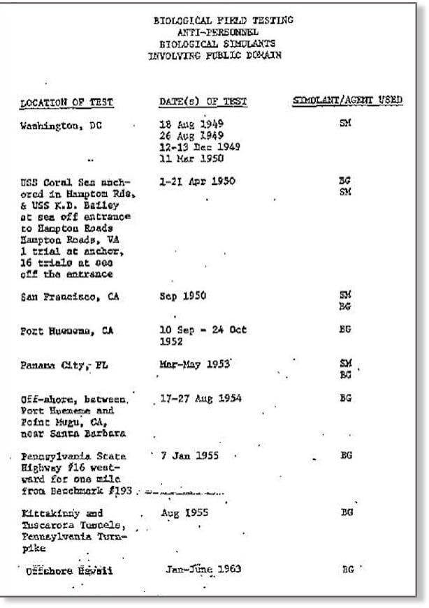 Ce que le Pentagone fait aujourd’hui est exactement ce qu’il a fait dans le passé, ce qui signifie que son programme d’armes biologiques n’a jamais pris fin. L’armée américaine a effectué 27 essais sur le terrain avec de tels substances simulant des agents biologiques, impliquant le domaine public de 1949 à 1968, lorsque le président Nixon a officiellement annoncé la fin du programme.