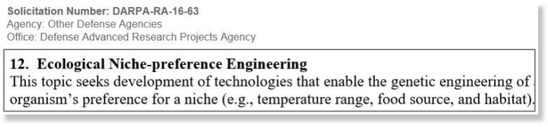 Dans le cadre d’un autre programme militaire — « Insect Allies » — les insectes génétiquement modifiés sont conçus pour transférer des gènes modifiés aux plantes. Le projet DARPA, d’une valeur de 10,3 millions de dollars, comprend la modification génétique des insectes et des virus qu’ils transmettent. L’« Ingénierie pour la préférence de niche écologique » est un troisième programme militaire en cours pour l’ingénierie du génome chez les insectes. L’objectif déclaré du Pentagone est de concevoir des organismes génétiquement modifiés afin qu’ils puissent résister à certaines températures, changer leur habitat et leurs sources de nourriture.