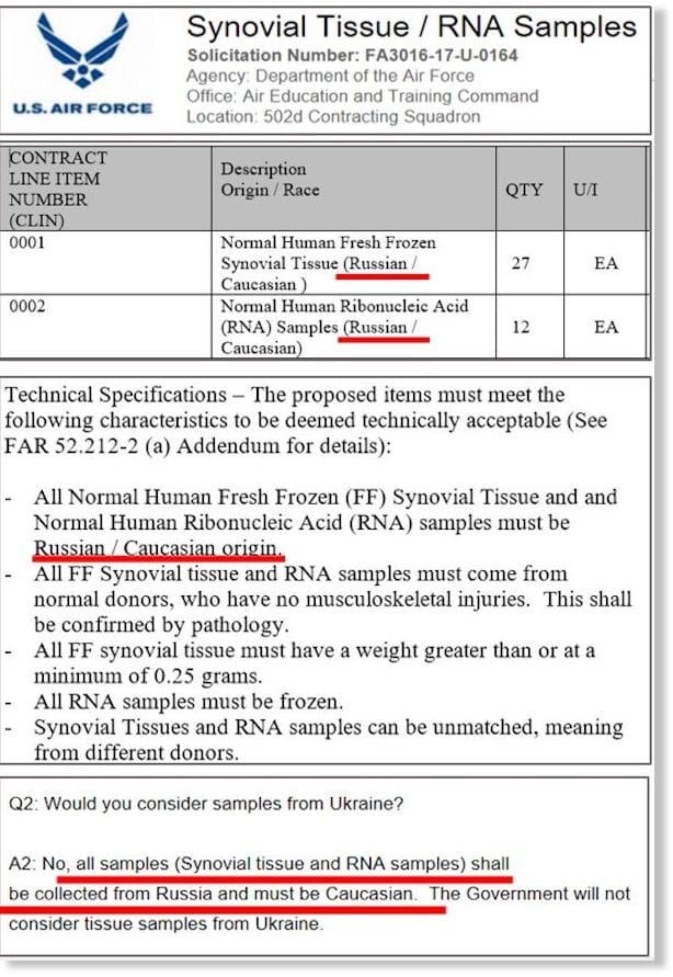 L’armée de l’air américaine a collecté des échantillons d’ARN russe et de tissus synoviaux, ce qui fait craindre à Moscou un programme clandestin d’armes biologiques ethniques américaines.