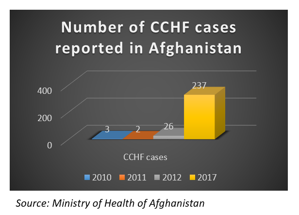 237 cas de fièvre hémorragique de Crimée-Congo (FHCC) ont également été signalés dans tout l’Afghanistan, dont 41 étaient mortels en décembre 2017. Selon le ministère afghan de la Santé, la plupart des cas ont été enregistrés dans la capitale Kaboul, où 71 cas ont été signalés avec 13 morts, et dans la province de Herat, près de la frontière avec l’Iran (67 cas).