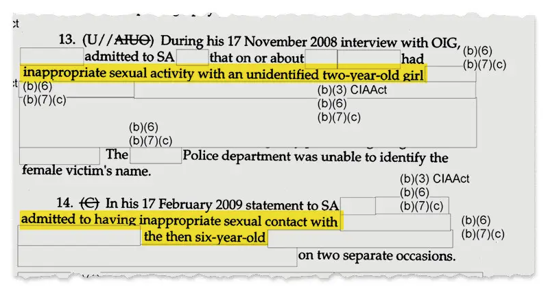 Au cours d’une enquête qui s’est terminée en août 2009, un fonctionnaire disposant d’une habilitation de sécurité a reconnu avoir eu des contacts sexuels avec deux filles, âgées de 2 et 6 ans, et téléchargé des images illicites alors qu’il travaillait pour la CIA. L’inspecteur général a ouvert une vaste enquête et tenté d’identifier les victimes.
