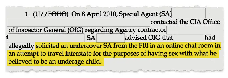 Selon un rapport de l’inspecteur général du 6 août 2013, une enquête sur un sous-traitant de la CIA soupçonné d’être en possession d’images d’abus sexuels sur des enfants a révélé des documents classifiés stockés sur son disque dur personnel et « de nombreux documents techniques liés aux systèmes de l’Agence ». sur son ordinateur portable. L’entrepreneur a été congédié et déchu de son habilitation de sécurité. Il a ensuite plaidé coupable aux accusations de maltraitance d’enfants et s’est inscrit en tant que délinquant sexuel. Le rapport indique que l’entrepreneur a été condamné, mais les détails, ainsi que son nom, ont été expurgés.