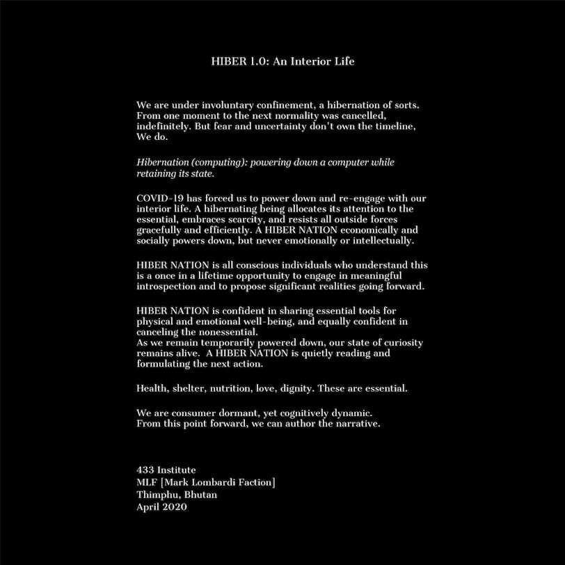 Le monde n’est plus en mouvement, le monde est définitivement en hibernation. Et selon la MLF [Mark Lombardi Faction] et la Société des Infiltrationnistes, l’HIBER NATION est la Nation du futur. Une Nation sans passeports, sans impôts, sans frontières. Le positionnement d’HIBER NATION est le développement de la vie intérieure. L’HIBER 1.0 remplace le Social 2.0.