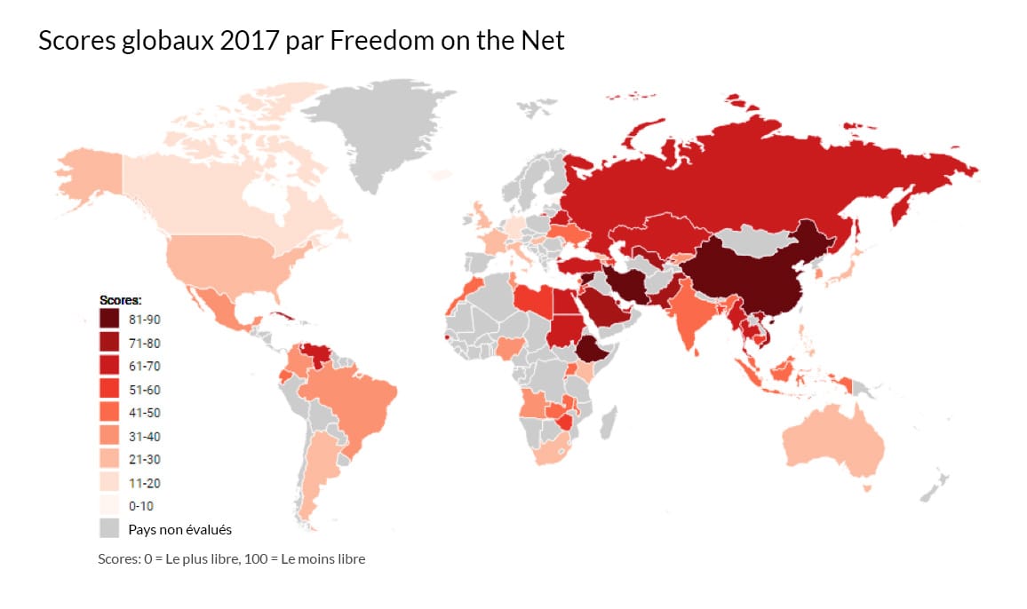 Nos ami(e)s de VPNMentor publie un résumé en français du rapport 2017 sur la liberté du Net produit par la ‘Freedom House’ pour donner accès aux informations clés du rapport aux médias locaux. Et ça fait terriblement froid dans le dos. Nous entrons dans une nouvelle ère que nous appelons ici : « L’art de la guerre sur internet ». Prenez le temps nécessaire pour lire ce qui va suivre, cela définit le monde dans lequel vont grandir vos enfants…