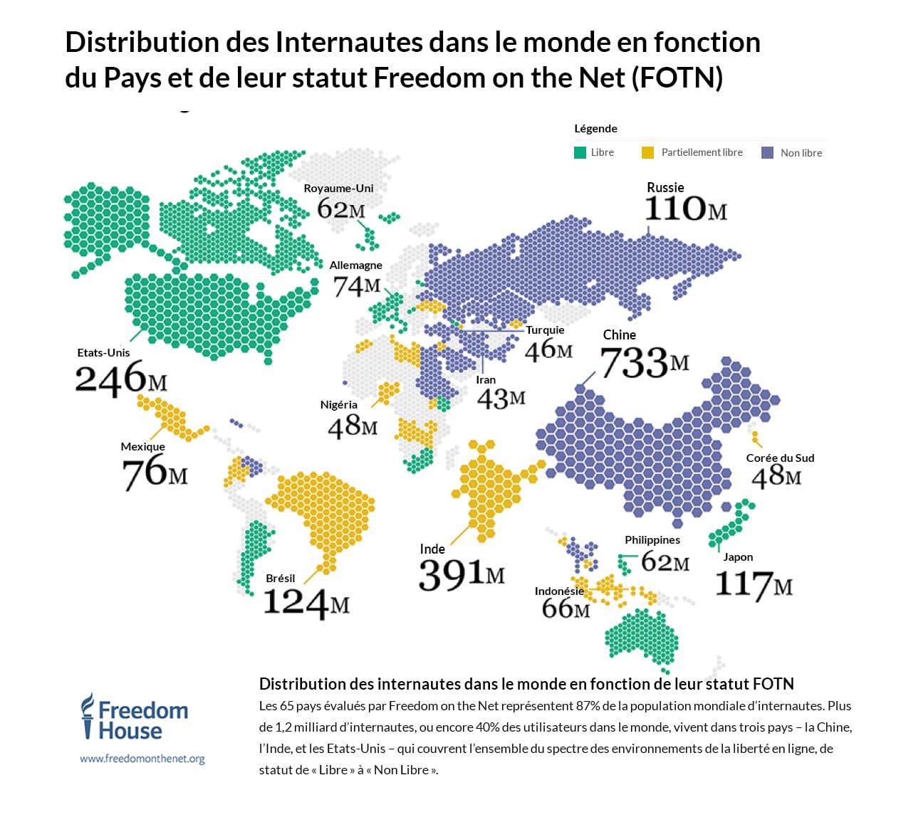 Presque la moitié des 65 pays évalués dans La liberté du Net 2017 (Freedom on the Net 2017) ont vu un déclin pendant la période d’analyse, alors que seulement 13 d’entre eux ont fait des avancées, mineures pour la plupart. Moins d’un quart des utilisateurs réside dans des pays où internet est considéré comme « libre », c’est-à-dire sans obstacles majeurs pour y accéder, sans restrictions onéreuses de contenus, ou violations sérieuses des droits des utilisateurs, sous forme de surveillance illimitée ou de répercussions injustes en cas d’expression légitime.