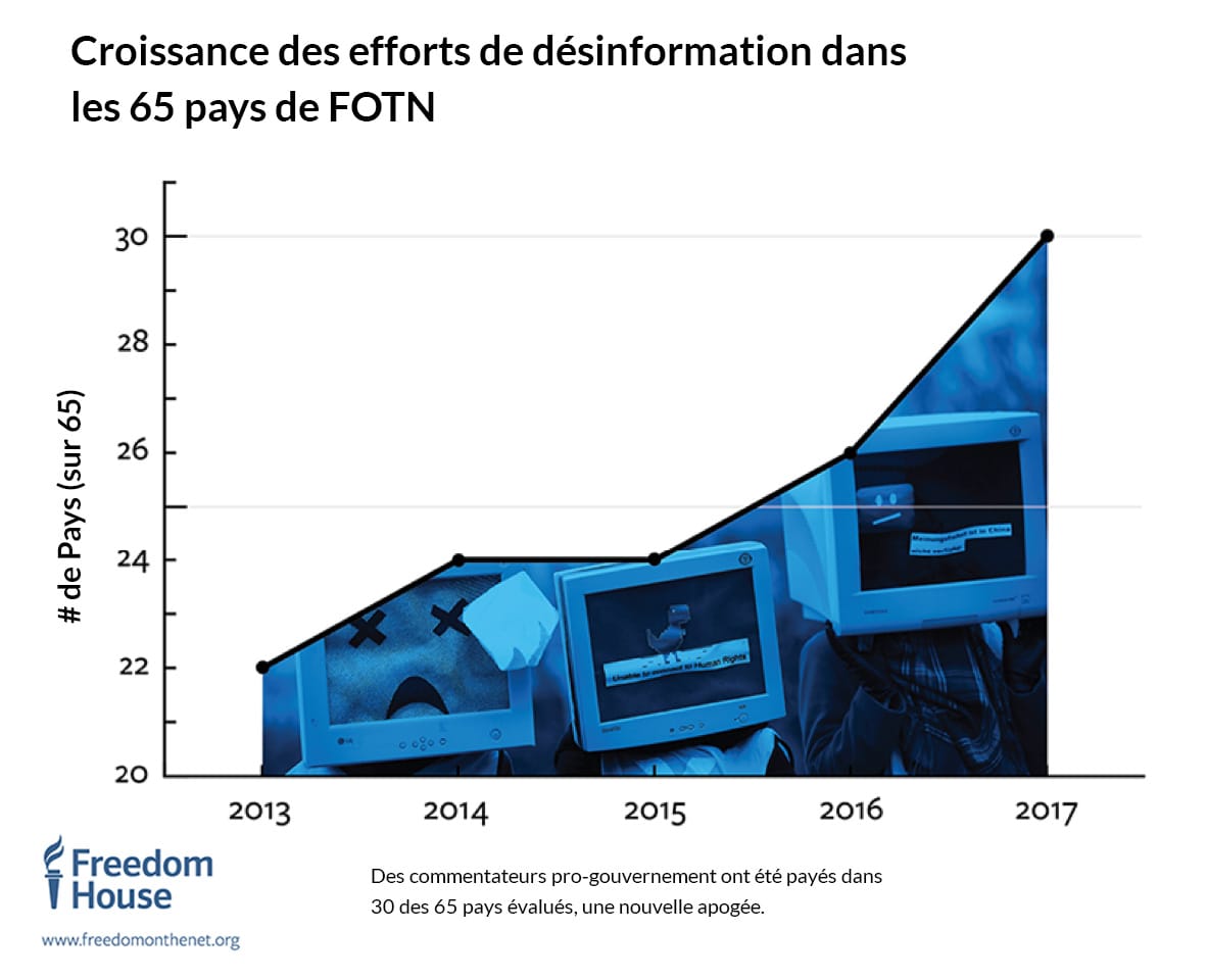 Les régimes répressifs cherchent depuis longtemps à contrôler le flux d’informations au sein de leurs territoires, une tâche rendue plus difficile depuis l’avènement d’internet. Quand les lois punitives, la censure en ligne et d’autres tactiques répressives se montrent peu adaptées et inefficaces, de plus en plus de gouvernements produisent leur propre contenu pour modeler le paysage numérique en leur faveur. Freedom House a commencé à pister l’utilisation de commentateurs rémunérés et pro gouvernement en 2009, mais de plus en plus de gouvernements emploient désormais toute une gamme de tactiques de manipulation sophistiquées qui bien souvent servent à se renforcer entre elles. Les autoritaristes se sont saisi des mêmes outils que ceux utilisés par de nombreux activistes démocratiques pour perturber la version officielle des médias de l’état, et les ont détourné pour en faire une arme antidémocratique.