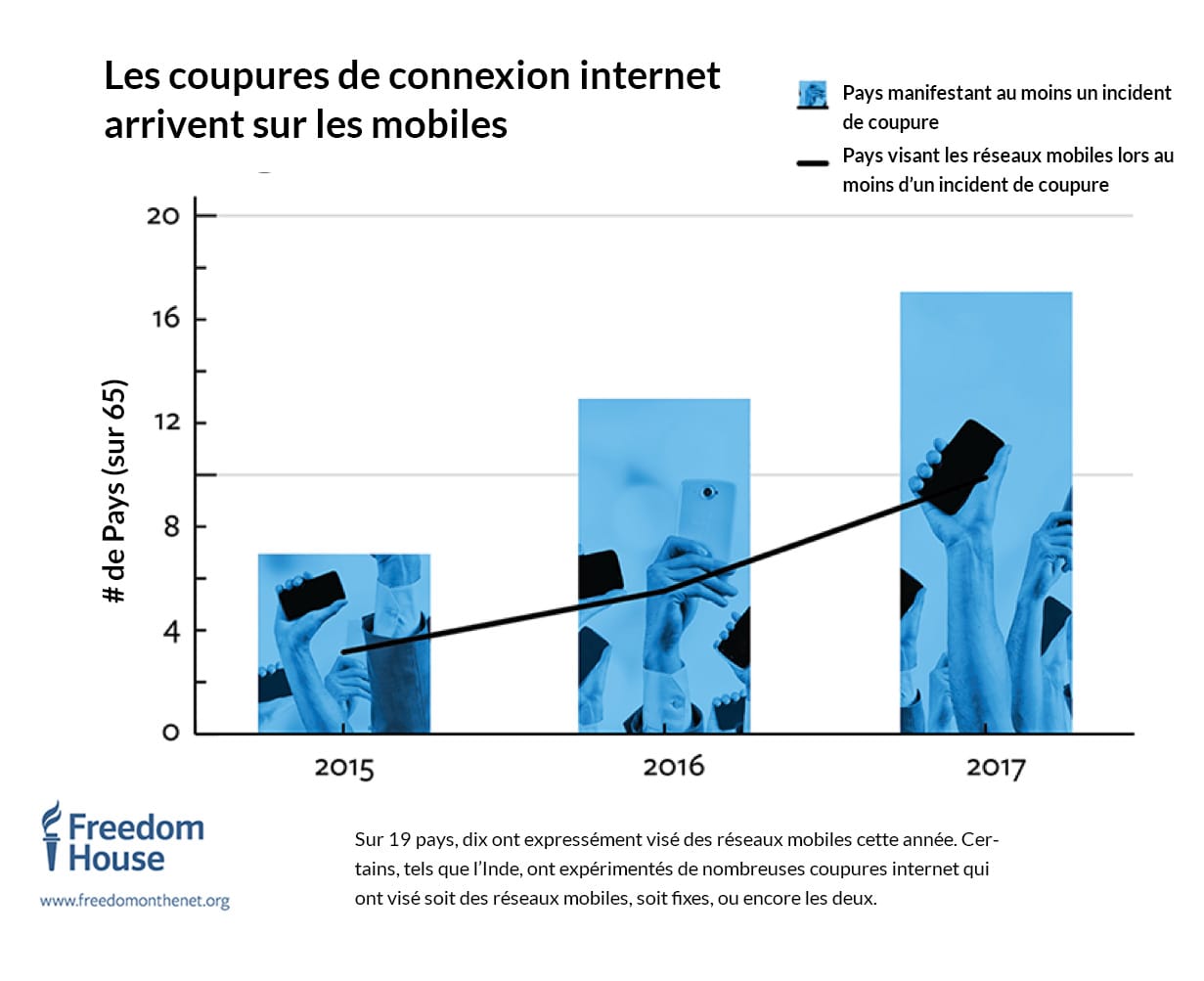 Les coupures de réseau – définies par Freedom House comme des restrictions intentionnelles de la connectivité des réseaux internet fixes, des réseaux mobiles ou des deux – ont eu lieu dans un nombre de pays croissant ces dernières années. Dans l’édition 2017, 19 pays sur 65 ont subi au moins une coupure de réseau pendant la durée de l’analyse, contre 13 pays dans l’édition 2016 et 7 dans celle de 2015. L’année passée, les autorités ont souvent invoqué la sécurité nationale et publique pour fermer les réseaux de communication, mais les véritables raisons allaient de conflits armés et malaise social à manifestations paisibles, élections, et rumeurs en ligne pouvant causer des remous.