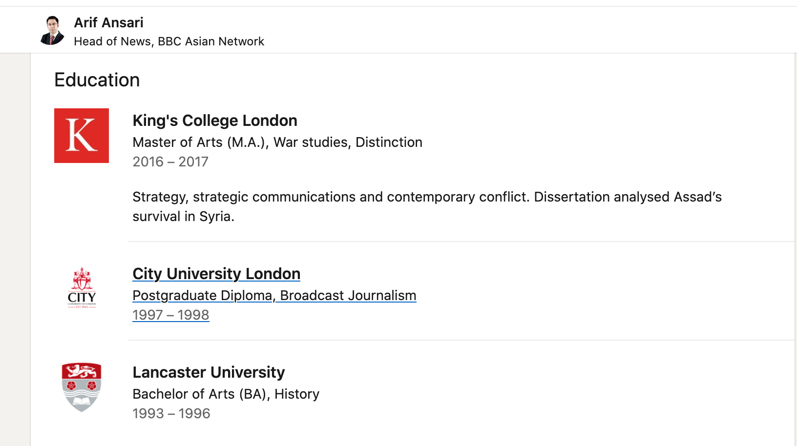 Sans surprise pour une université basée à Londres, la principale destination journalistique des diplômés du Department of War Studies est le Royaume-Uni. En effet, la BBC , le puissant radiodiffuseur d’État du pays, regorge d’anciens élèves des études sur la guerre. Arif Ansari, responsable des informations au BBC Asian Network , a terminé une maîtrise en analyse de la guerre civile syrienne en 2017 et a rapidement été sélectionné pour un programme de développement du leadership, le plaçant à la tête d’une équipe de 25 journalistes qui organisent des informations principalement axées sur l’important. Communautés du Moyen-Orient et d’Asie du Sud en Grande-Bretagne.