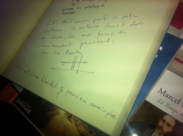 Nous avons annoté le livre d’or, acte de rébellion aussi inutile que puéril, mais jouissif. Et le bonheur de ne pas se sentir seul en ce monde, en lisant cette phrase (en haut de la photo) « je trouve ceci pathétique et lamentable« . Et instinctivement, un amour né pour cette main, d’homme, de femme, qui a tracé son opinion sur un coin de feuille. Et les mots, monsieur Arnault, reprennent tout leur sens. Magie instantanée entre deux inconnus.