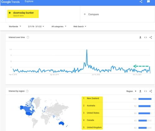 Depuis l’invasion, les gens en Nouvelle-Zélande, en Australie, aux États-Unis, au Canada et au Royaume-Uni recherchent en panique « doomsday bunker ». La tendance à la recherche a explosé pour atteindre des sommets jamais vus en un an à la fin de la semaine dernière.
