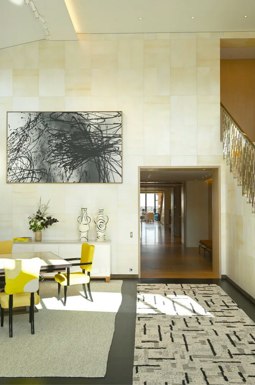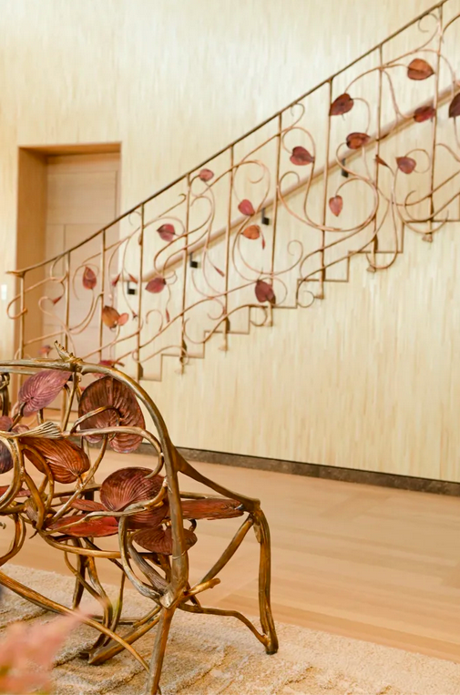 Dans la salle à manger de l’appartement, un tableau abstrait, T1989-L42 de Hans Hartung, est suspendu au-dessus d’une rangée de chaises jaune citrine. Une rambarde fleurie dorée se déroule le long d’une cage d’escalier : commandée en plus d’une causeuse et de deux sculptures, explique fièrement Arnault, elle représente une partie de l’œuvre finale entreprise, en 2018, par l’artiste Claude Lalanne.