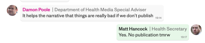 Cet échange fait partie des #Lockdownfiles, des messages WhatsApp entre membres du gouvernement qui jettent une lumière crue sur leur stratégie. Le Daily Telegraph feuilletonne dessus depuis plusieurs jours.