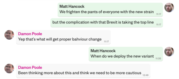 Un secrétaire d’État dans cet échange de janvier 2021 converse avec Matt Hancock et dit : « Les petites choses c’est ridicule L’intensification des messages – le facteur peur/culpabilité est vital. »