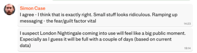 On découvre dans ces messages que les responsables au sein du gouvernement britannique ont agit activement pour inciter la population à se plier aux mesures sanitaires décidées pendant la pandémie de Covid-19, avec un moteur plutôt orienté vers le souhait de susciter la peur. L’enjeu était donc d’obtenir le respect des contraintes comme les confinements. Pour cela, des scénarios semblent avoir été établis. On y parle de « narratifs » concernant le fait que « les choses vont vraiment mal » que l’on travaille à maintenir :